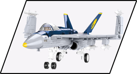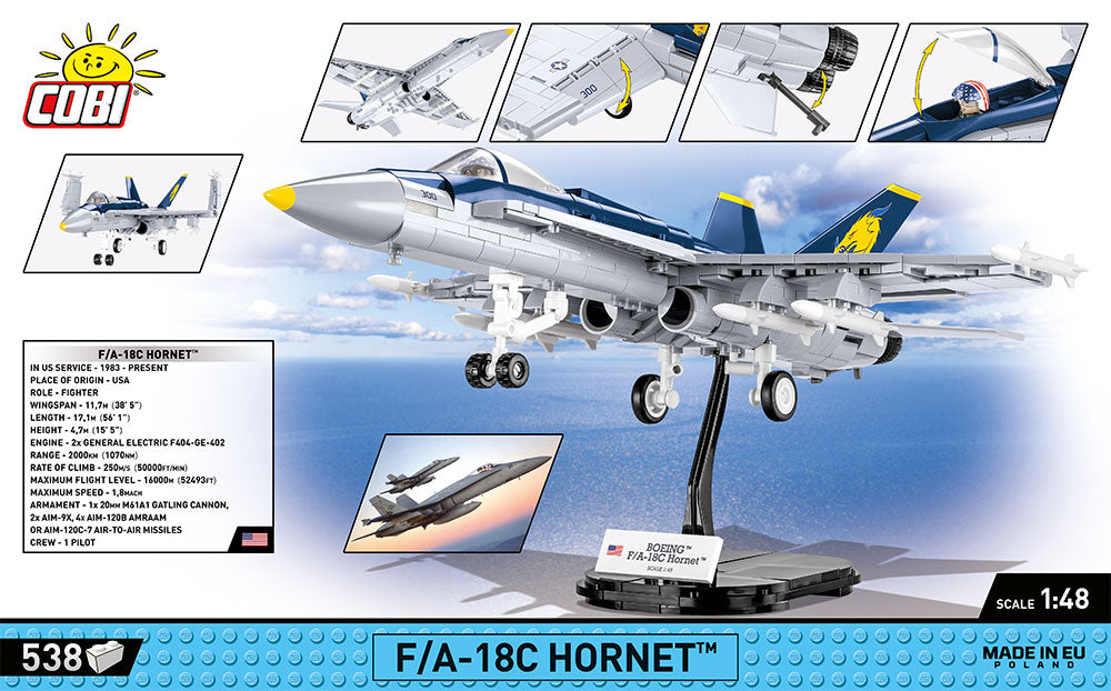 F/A-18C Hornet™ is a unique model of a multirole fighter in the colours of the famous fighter squadron of the US Navy. The aircraft was prepared in a model scale of 1:48 using 538 COBI construction blocks. In the set you will find high-quality prints reproducing the painting of the original machine. The model was equipped with a folding chassis and rotating wheels. In On the blocks there are high-quality prints. There are no stickers here! Under the wings there is a large arsenal of weapons. In the cabin we can put a special block-pilot. The set also includes a brick display stand and a plate containing the name of the aircraft. This exclusive licensed set is aimed at everyone regardless of age of aviation and military fan. The plane looks equally attractive in a serious office and in a teenager's room.