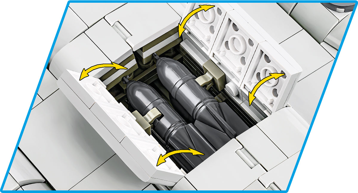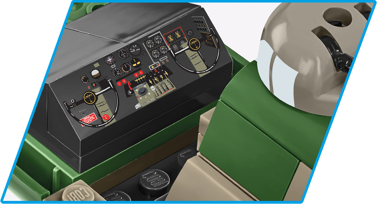 The Memphis Belle is the most famous B-17 Flying Fortress used by the United States Army Air Forces (USAAF) during World War II. The aircraft gained popularity thanks to its successful series of 25 bombing missions over Europe. An excellent war film also tells its story. The realistic EXECUTIVE EDITION brick model includes the paint scheme and markings of the historical machine and consists of over 1300 elements. This impressive model has a wingspan of 66cm when built. Once built it will also become one of the biggest pieces in your brick collection. Seeing the amazing details and admiring the amount of weapons you will quickly find out why this plane was called the "Flying Fortress"! The two pilot figures included in the set feature highly-detailed prints. The set also offers movable elements such as wheels, folding landing gear, propellers, ailerons and openable bomb hatches. The set includes a special block display stand featuring a black plate with the name of the historic aircraft. Thanks to the intuitive instructions based on clear illustrations the construction is simple. The plane is a must-have item for all enthusiasts of history, aviation and military technology. The huge number of pieces also ensures many hours of exciting construction. The set was entirely produced in Poland within the European Union.