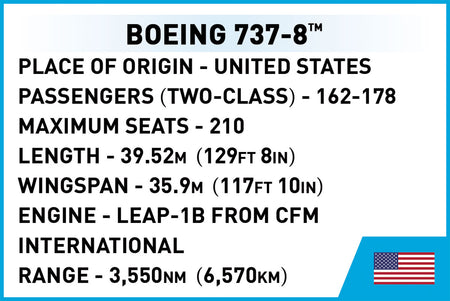 The model of the modern Boeing 737-8™ passenger plane has been faithfully reproduced from 340 COBI construction blocks. Specially designed 1:110 scale elements faithfully reflect the shape of the original. The aircraft is equipped with rotating wheels and folding landing gears. Engines with rotating rotors are mounted under the characteristic wings. The set is completed with a black brick display stand, to which you can attach the included plate with the name of the aircraft! The set uses only permanent prints. No stickers here! The Boeing 737-8™ from COBI is the perfect purchase for all fans of civil aviation, technology and building with construction blocks. Thanks to faithfully reproduced details, it will delight adult collectors, teenagers and young flying enthusiasts, alike!