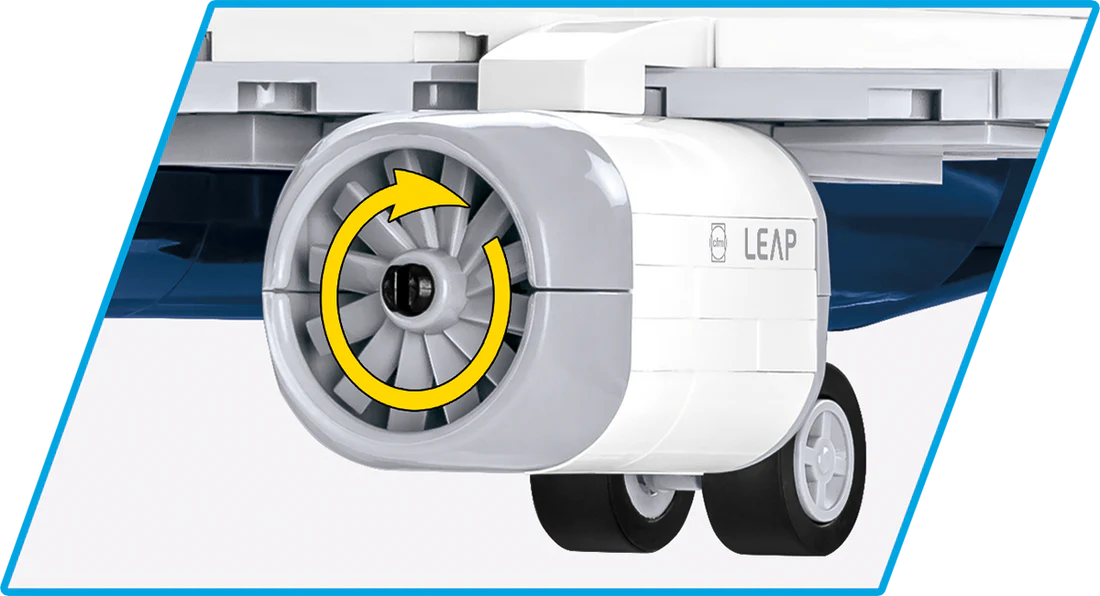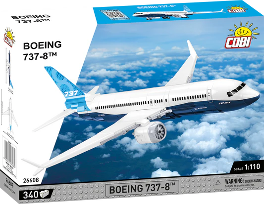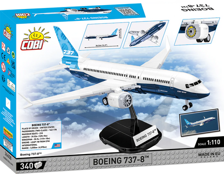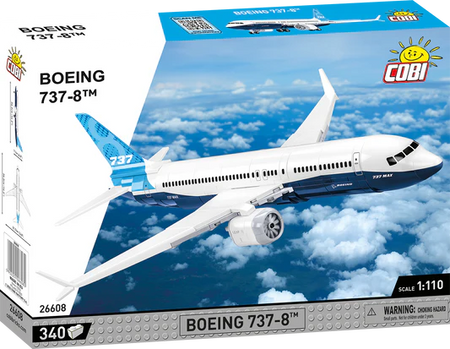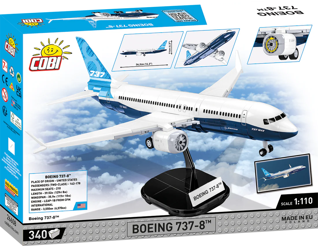 The model of the modern Boeing 737-8™ passenger plane has been faithfully reproduced from 340 COBI construction blocks. Specially designed 1:110 scale elements faithfully reflect the shape of the original. The aircraft is equipped with rotating wheels and folding landing gears. Engines with rotating rotors are mounted under the characteristic wings. The set is completed with a black brick display stand, to which you can attach the included plate with the name of the aircraft! The set uses only permanent prints. No stickers here! The Boeing 737-8™ from COBI is the perfect purchase for all fans of civil aviation, technology and building with construction blocks. Thanks to faithfully reproduced details, it will delight adult collectors, teenagers and young flying enthusiasts, alike!