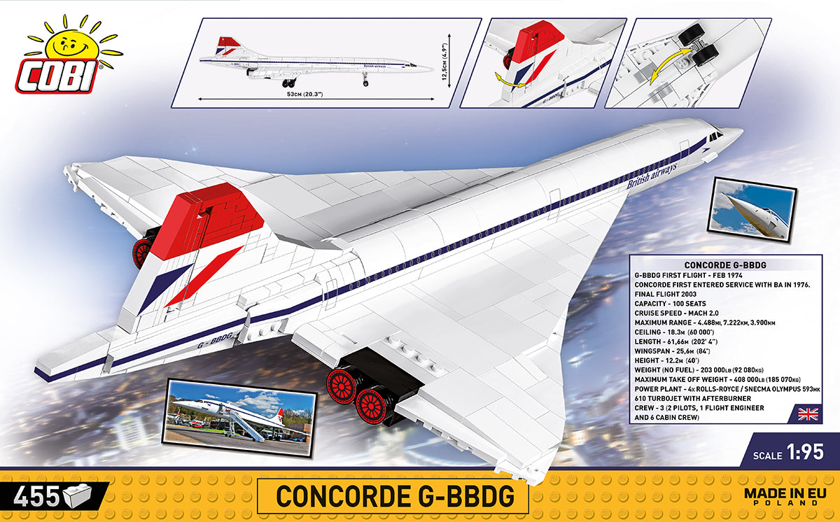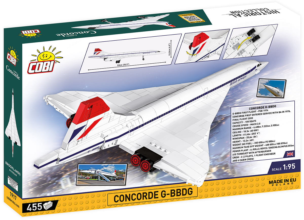 From the world of COBI comes a model that features the Concorde G-BBDG supersonic passenger aircraft. This was a test model for British Airways. For several years it was used on test flights & never entered service. Over time, it began to be used as a base of spare parts for the other craft that were in service. Since 2003, the aircraft has been exhibited at the Brooklands Museum (Weybridge).