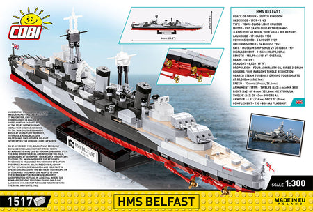 The COBI company, as part of a prestigious cooperation with the IMW (Imperial War Museums), has prepared a model of the historic British cruiser HMS Belfast. The ship was designed on a scale of 1:300 and faithfully reflects the details of its historical inspiration. The light cruiser is 64 cm / 25.2" long and 19.5 cm / 7.7" high. It has many movable elements, such as deck guns, rotating artillery towers, rudders and propellers. The model has been covered with high-quality prints representing equipment and camouflage. Prints do not rub off even during intensive use. The set includes a black display stand and a white plate with the name and scale of the model printed on it. The plaque also features the IMW (Imperial War Museums) logo. The Belfast will make a perfect gift for all lovers of history, military and marine science. It will also look great on a desk, bookshelf or on a shelf with souvenirs. Build history, piece by piece, with COBI.