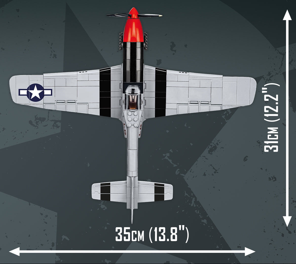 The Mustang P-51D is a building-block model from the film released under the original TOP GUN: Maverick™ license. The main character of the film, Maverick, prides himself on flying this historic aircraft. You can now build your own Mustang on a model scale of 1:32. The set has been faithfully reproduced from 350 COBI building blocks. In the set you will find high-quality prints accurately reproducing the original painting of the film aircraft. The model is equipped with rotating propellers, lockable chassis, movable wheels and an opening canopy, where you can place our special figure inspired by the main character of the film. It also includes an elegant block display stand and a plaque containing the name of the aircraft and the film logo. This exclusive licensed kit is certainly a great gift idea for builders of all ages who are movie fans, both of aviation and military movies. It looks perfect in an elegant office or in a teenager's bedroom.
