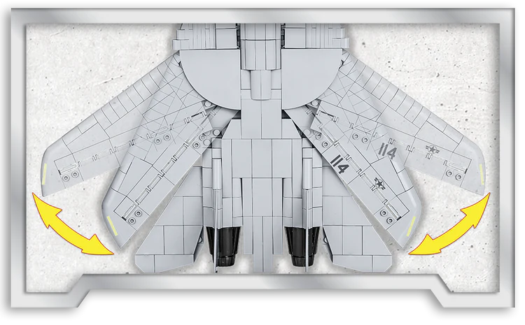 The COBI F-14 TOMCAT is a unique aircraft model released under the original TOP GUN™ and NORTHROP GRUMMAN license. Legendary U.S. Navy film pilot Pete "Maverick" Mitchell and his partner "Goose" fly just such a two-seater aircraft. Returning to this iconic film production, you can now build your own F-14 in 1:48 scale! The model has been faithfully reproduced from 754 COBI building blocks. In the set you will find high-quality prints faithfully replicating the original painting of the film jet. The model is equipped with variable geometry movable wings and rotating wheels. Under the wings there is a large arsenal of weapons. There are two figures in the cockpit. The figures mimic the appearance of the characters of the film and are equipped with distinctive helmets and oxygen masks. The F-14 set also includes an elegant block display stand and a plaque containing the name of the aircraft and the movie logo. This exclusive licensed set will certainly be a unique gift for anyone who loves aircraft, regardless of the age of the aircraft enthusiast. The F-14 will also look perfect in an elegant office or in a teenager's room.