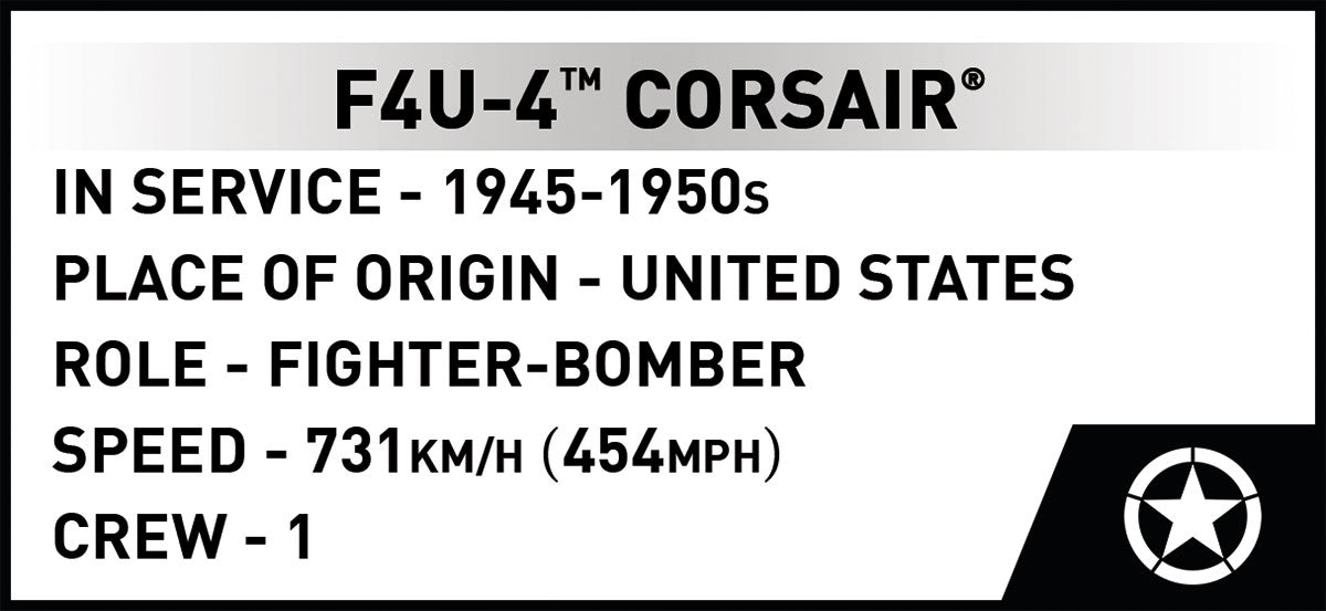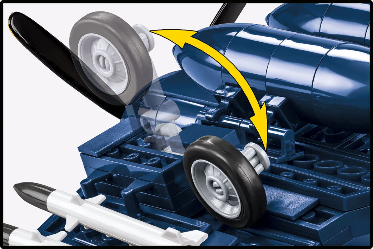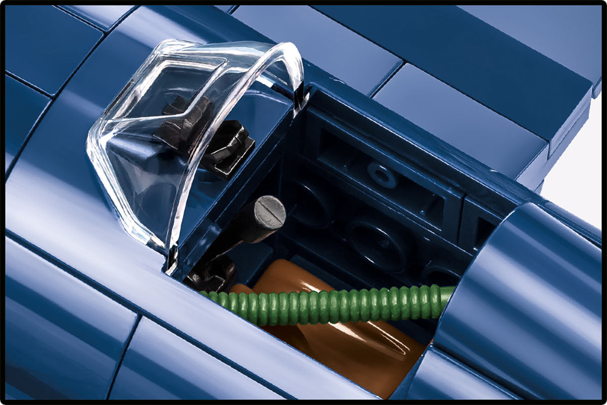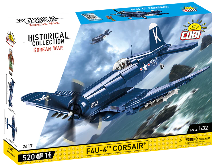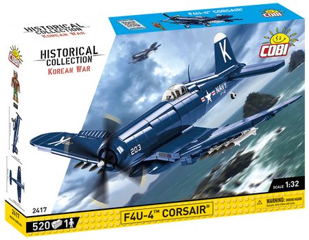 The Vought F4U-4 Corsair kit was released under the license of the Northrop-Grumman concern and contains 520 high-quality components. The historical pilot figure has been enriched with an additional head that can be mounted interchangeably. The fighter plane model from COBI was created with attention to the smallest details in a 1:32 scale. It is covered with high-quality prints that do not wear off even during intensive use. The cabin opens and a figure can be placed in it. Other moving parts include ailerons, a propeller and folding wheels. The printed markings refer to the heroic pilot from the Korean War. The whole set is complemented by a display plate with the name of the aircraft model printed on it. The Corsair by COBI also perfectly complements the other WWII and Korean war planes in 1:32 scale. It is one of the most beautiful block models ever made and always attracts attention due to the extremely characteristic appearance of hinged and folded wings.