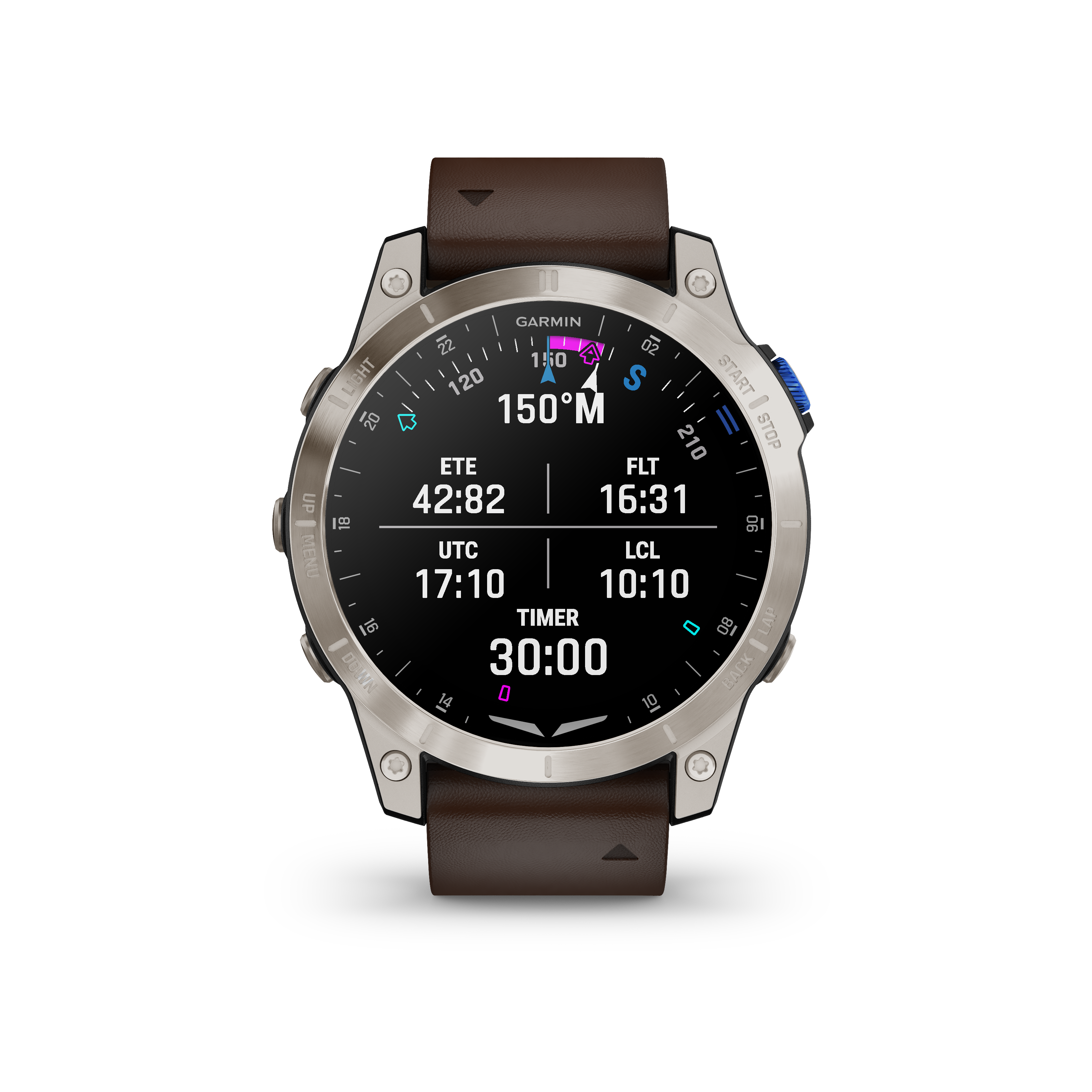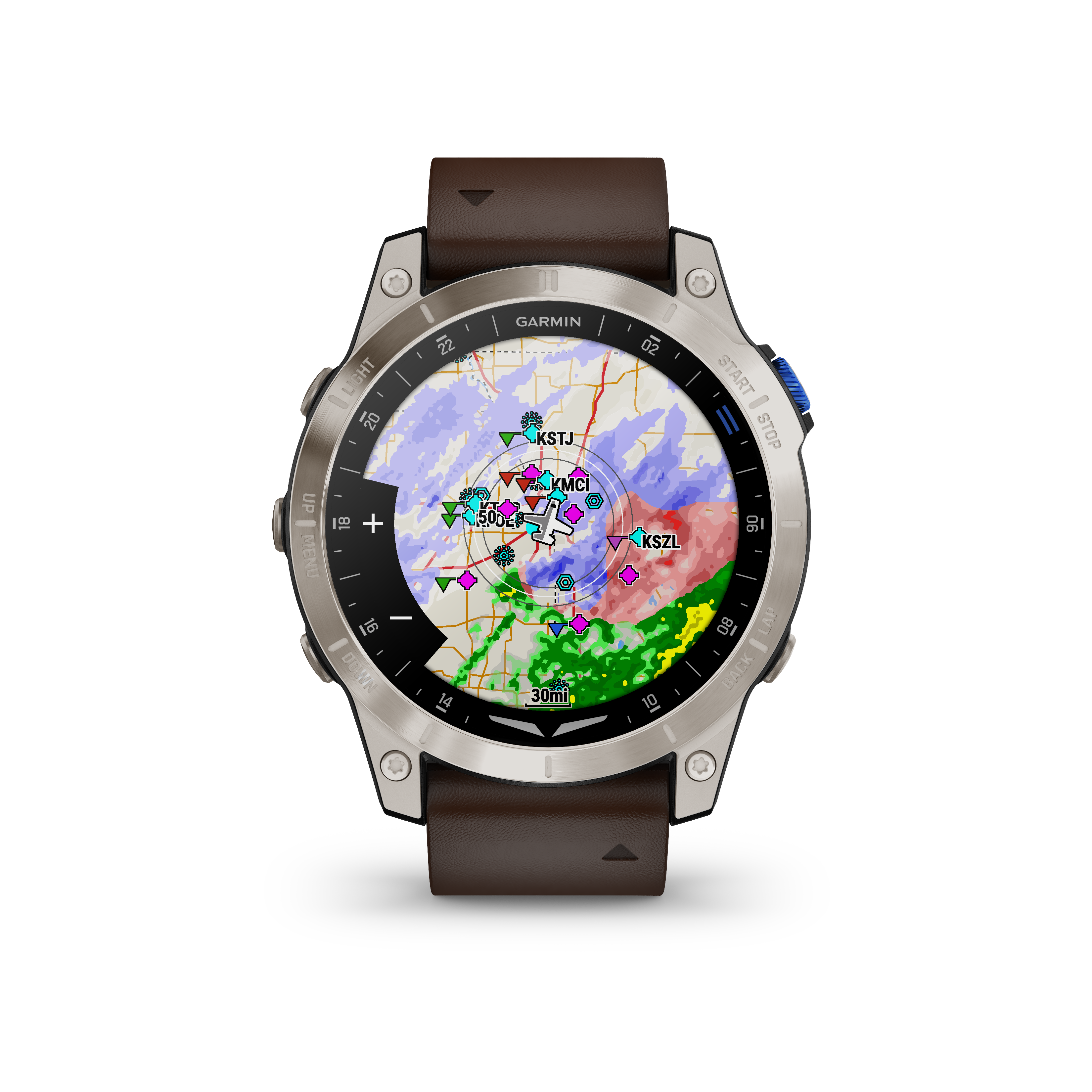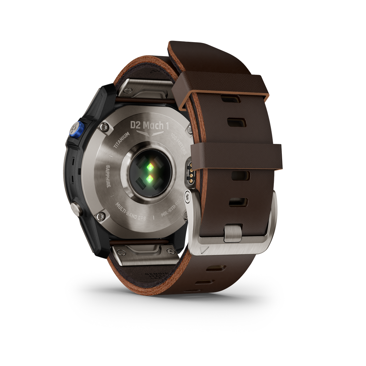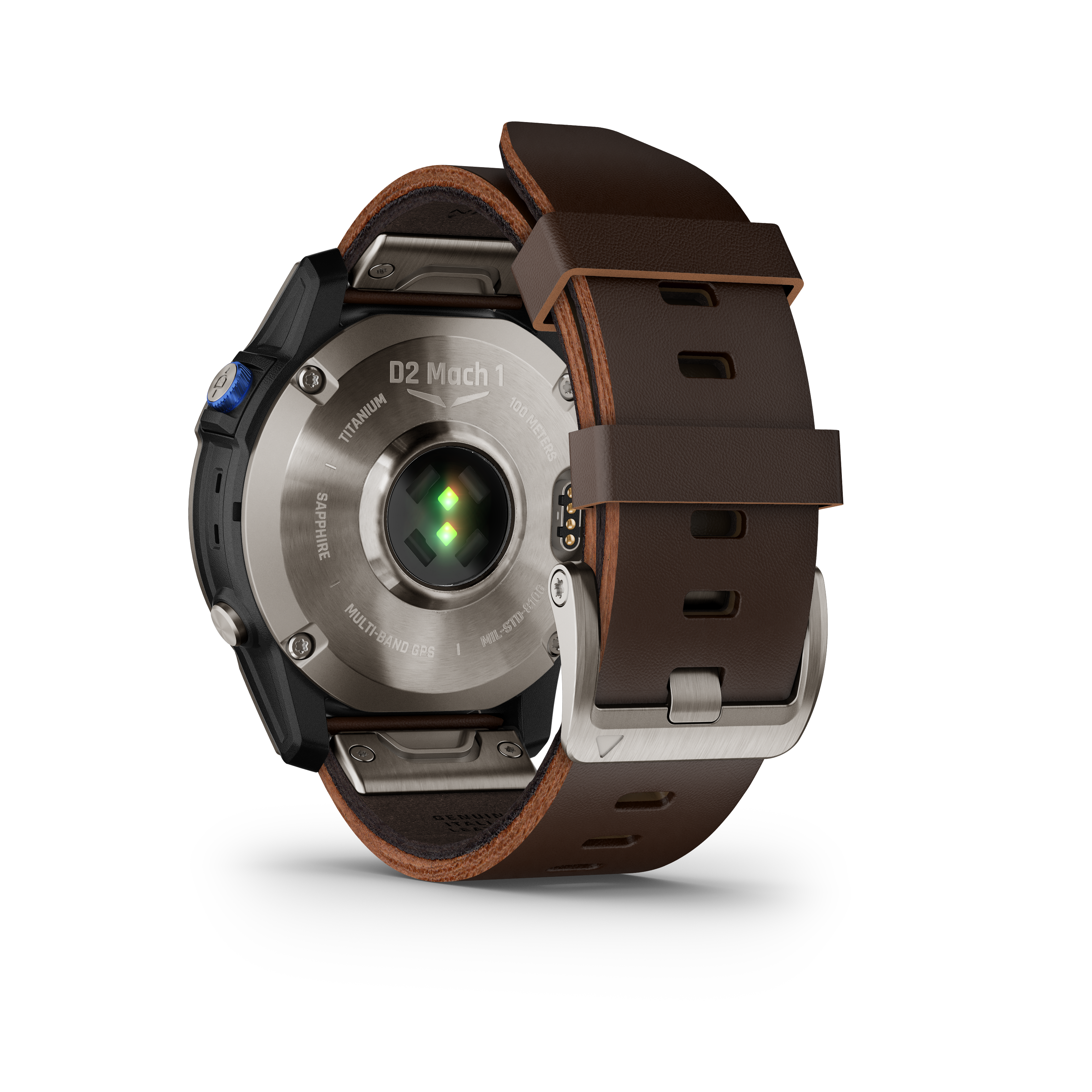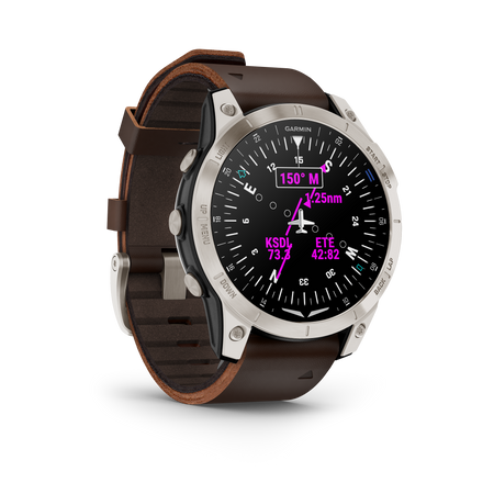 Accelerate the adventure with the D2™ Mach 1 GPS aviator smartwatch. With classic style and a vivid AMOLED touchscreen display, this premium timepiece puts the most advanced tools for flying right at your fingertips. Check weather reports and radar1, get automatic alerts for changing conditions1, and navigate with the moving map, worldwide aeronautical database, and HSI—plus more. Pair with the Garmin Pilot™ app1to transfer flight plans to the watch and log your flights automatically. Use the smartwatch’s health and wellness features to help ensure you’re ready for your next flight—and find new ways to move with its more than 30 built-in sports apps and animated workouts. And be ready for departure with up to 11daysofbattery life