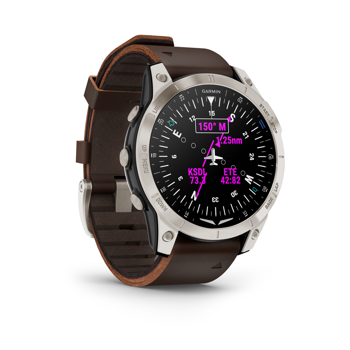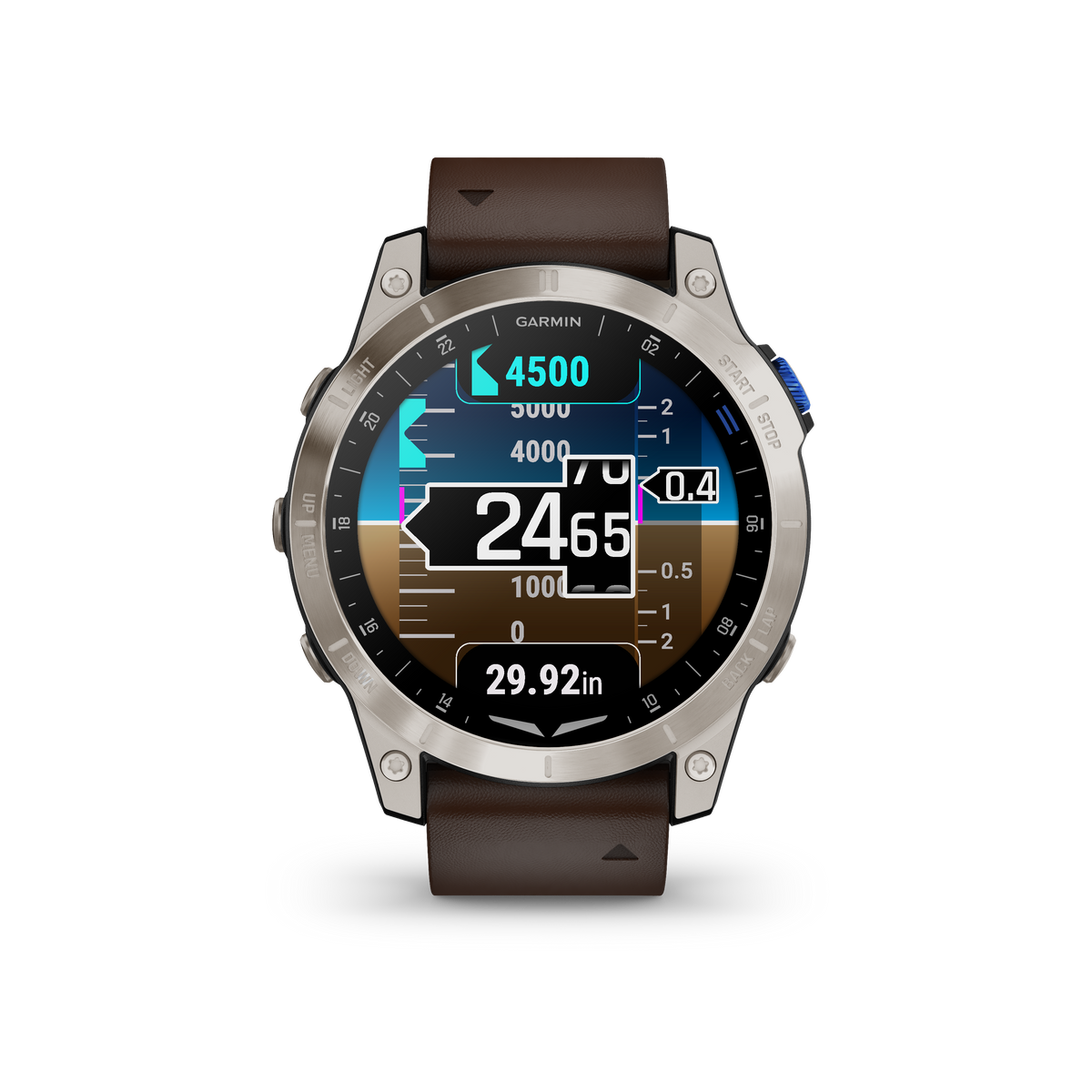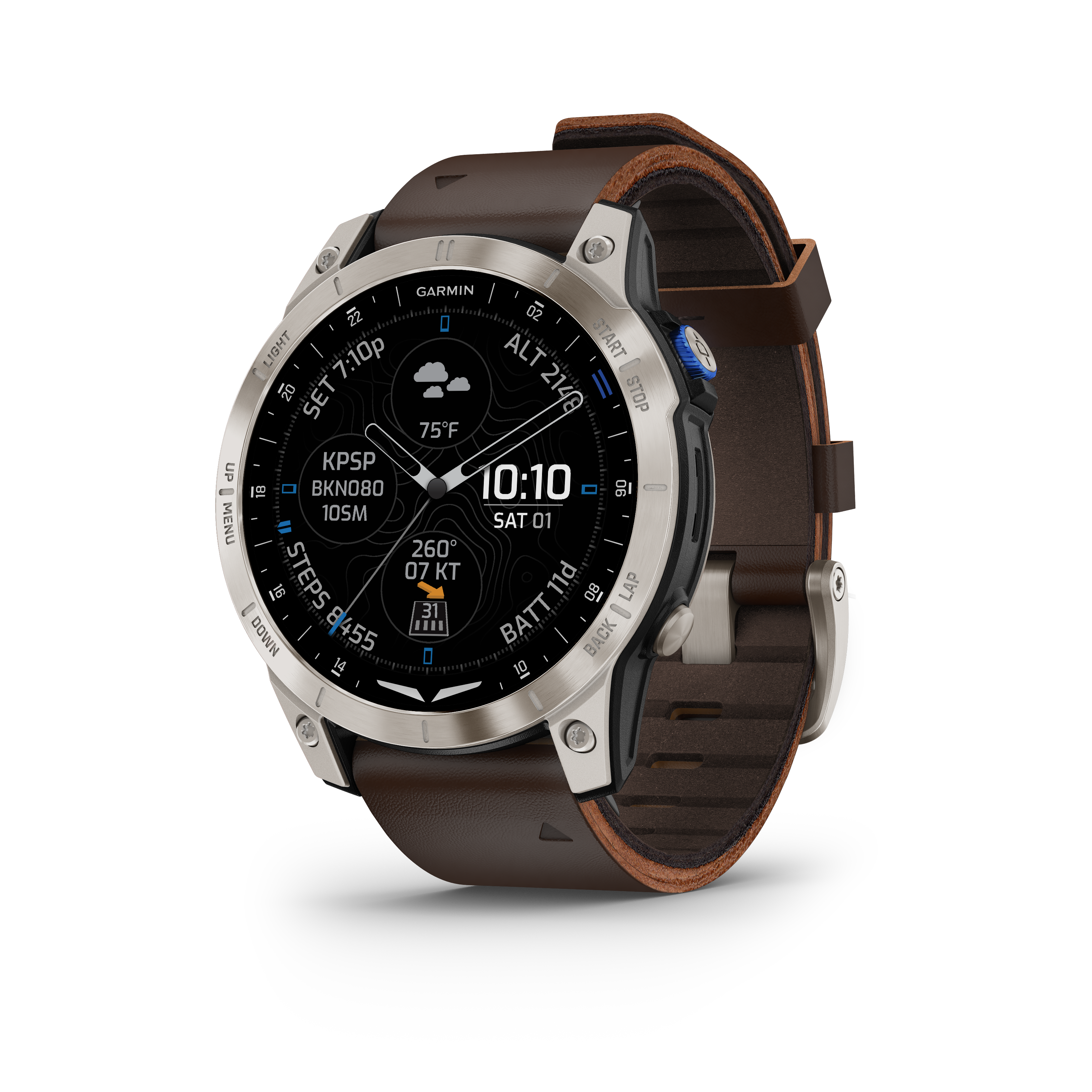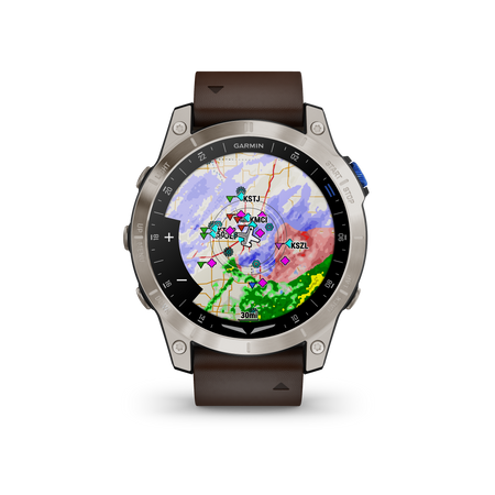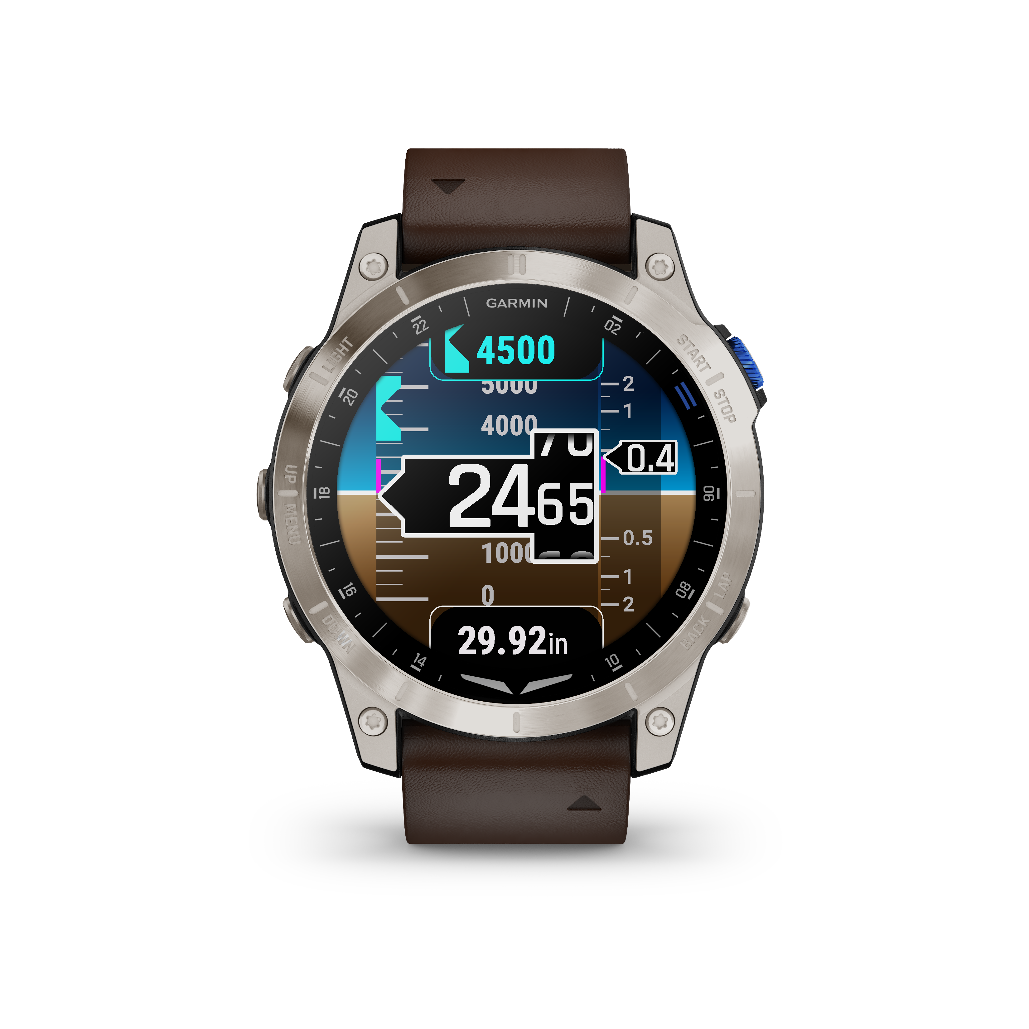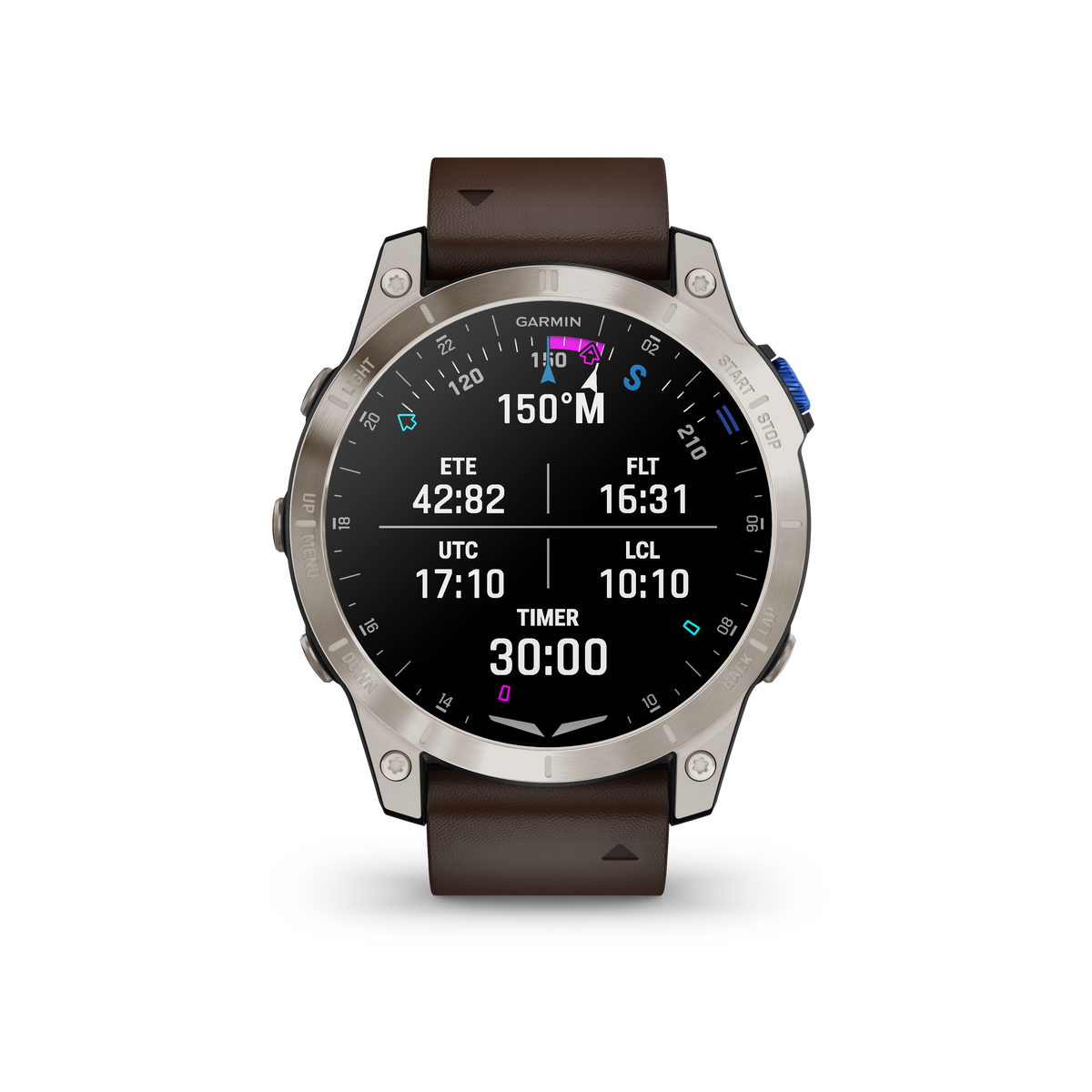 Accelerate the adventure with the D2™ Mach 1 GPS aviator smartwatch. With classic style and a vivid AMOLED touchscreen display, this premium timepiece puts the most advanced tools for flying right at your fingertips. Check weather reports and radar1, get automatic alerts for changing conditions1, and navigate with the moving map, worldwide aeronautical database, and HSI—plus more. Pair with the Garmin Pilot™ app1to transfer flight plans to the watch and log your flights automatically. Use the smartwatch’s health and wellness features to help ensure you’re ready for your next flight—and find new ways to move with its more than 30 built-in sports apps and animated workouts. And be ready for departure with up to 11daysofbattery life