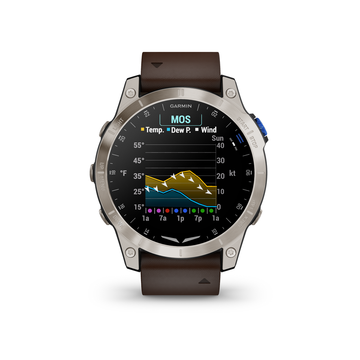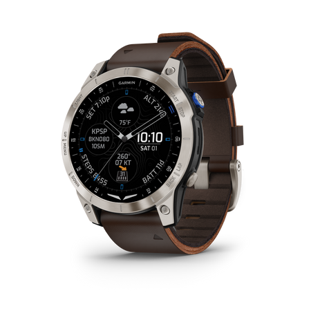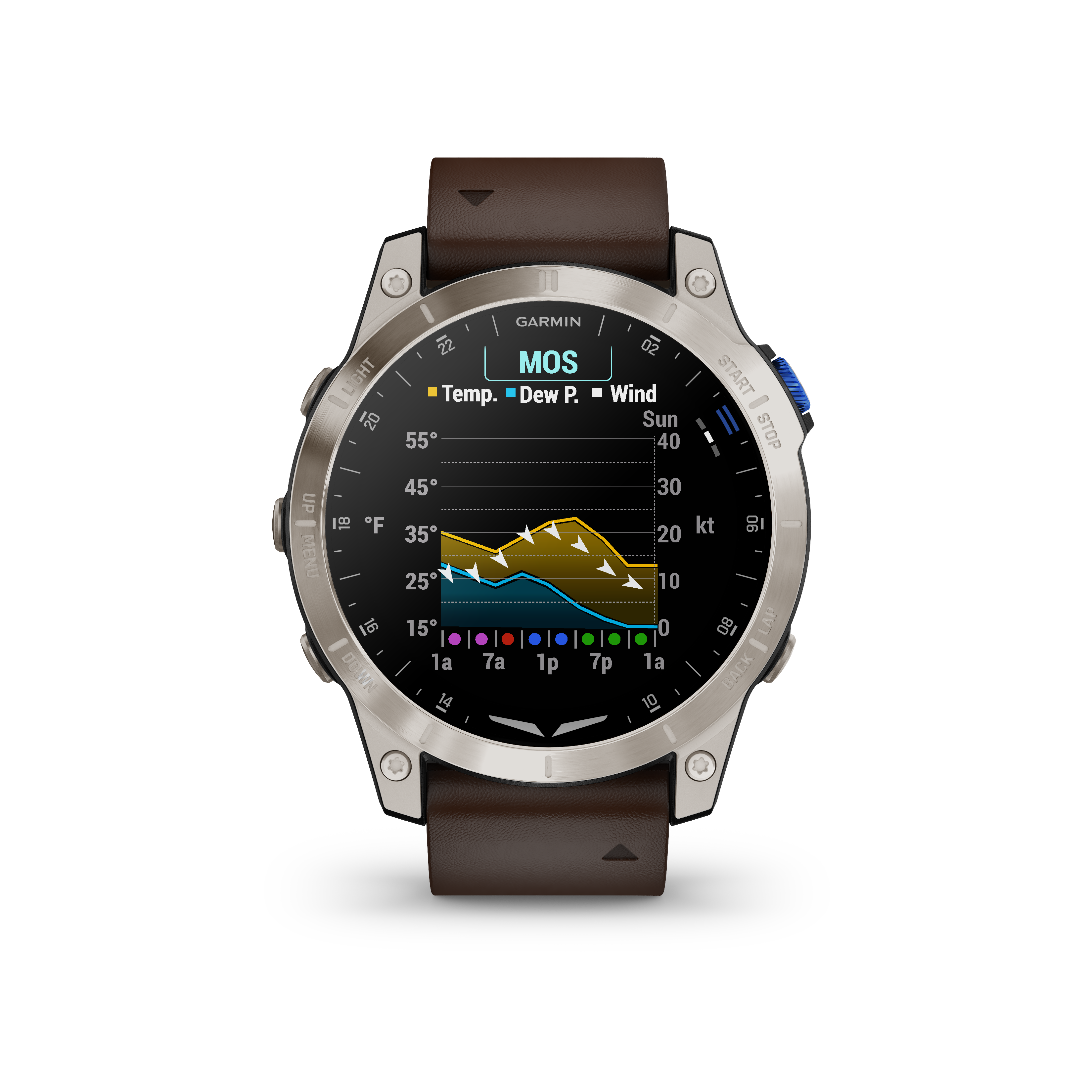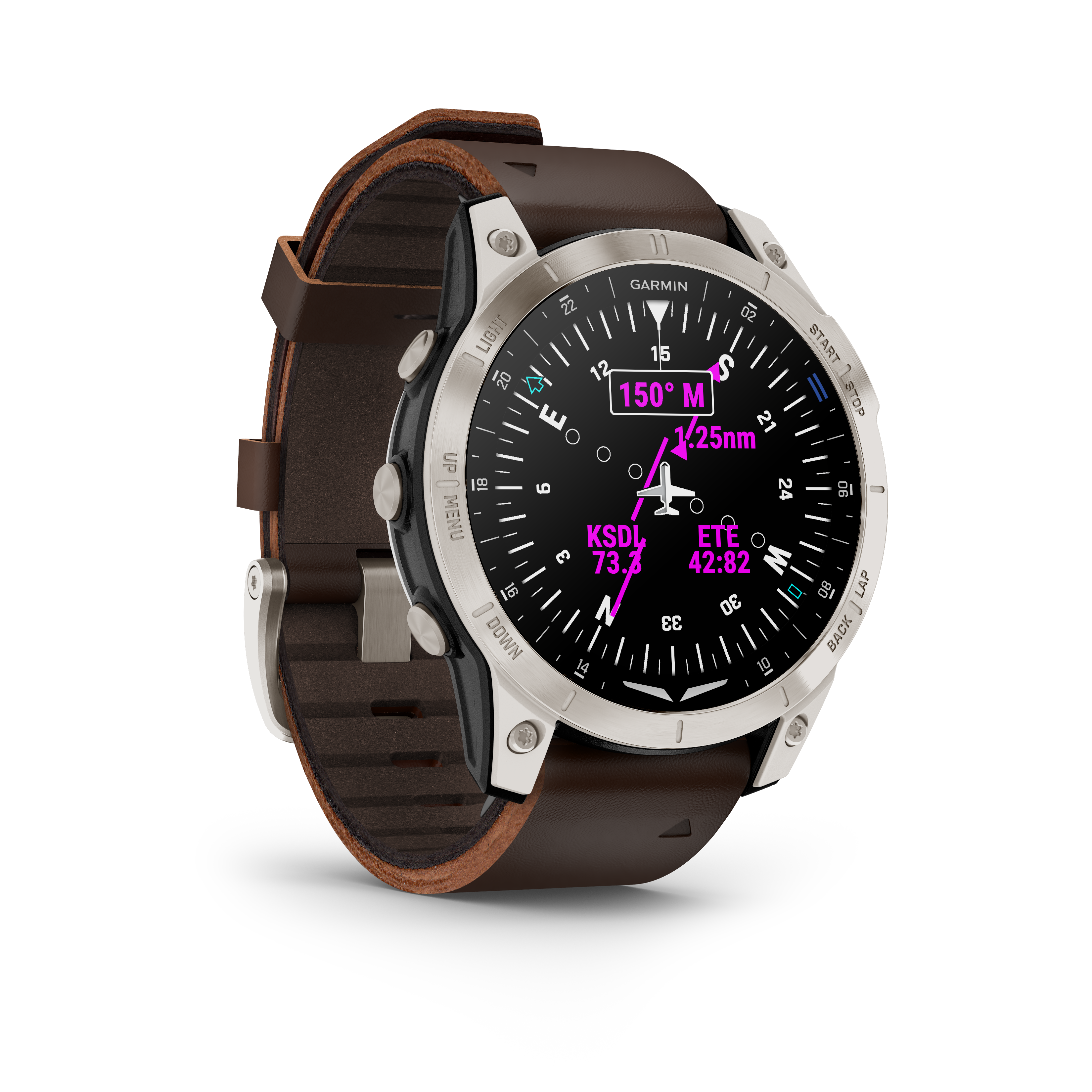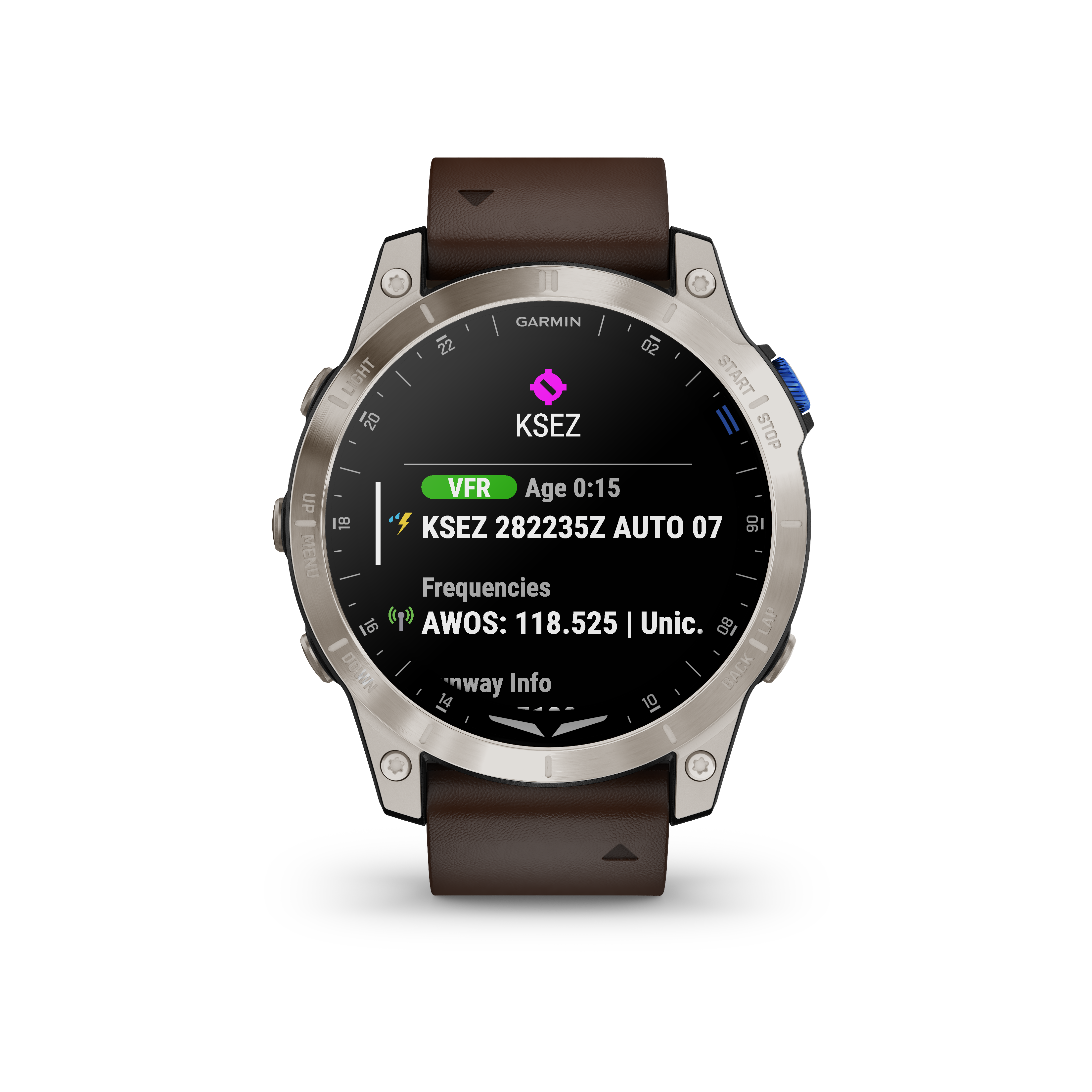 Accelerate the adventure with the D2™ Mach 1 GPS aviator smartwatch. With classic style and a vivid AMOLED touchscreen display, this premium timepiece puts the most advanced tools for flying right at your fingertips. Check weather reports and radar1, get automatic alerts for changing conditions1, and navigate with the moving map, worldwide aeronautical database, and HSI—plus more. Pair with the Garmin Pilot™ app1to transfer flight plans to the watch and log your flights automatically. Use the smartwatch’s health and wellness features to help ensure you’re ready for your next flight—and find new ways to move with its more than 30 built-in sports apps and animated workouts. And be ready for departure with up to 11daysofbattery life