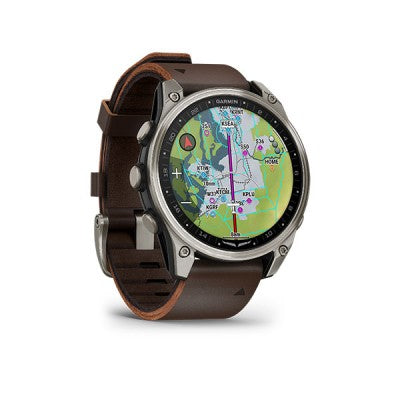 ![]() D2™ Mach 2 is the most highly evolved Garmin aviator smartwatch to date. It combines classic aviation styling with a durable DLC-coated titanium bezel, sapphire lens, bright 1.4" AMOLED touchscreen display, advanced flight mapping and powerful built-in LED flashlight. D2 Mach 2 has convenient tools for every phase of flight, including an on-device aeronautical database, HSI and Direct-to navigation. Access NEXRAD, METARs and TAFs — plus set personal minimums to stay ahead of the weather (when paired with your smartphone). The built-in speaker and microphone let you make and take calls from your wrist when your watch is paired with your smartphone. Use voice commands to get METAR information, start a flight, select a destination airport and more. Advanced health and fitness features help keep you on top of your game with strength training plans, daily suggested workouts and monitoring of heart rate, respiration, stress, sleep and more (data presented is intended to be a close estimation of metrics tracked). With up to 26 days of battery life in smartwatch mode (51mm variant, 14 days for 47mm variant), D2 Mach 2 is powered for life on the go. |
