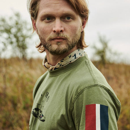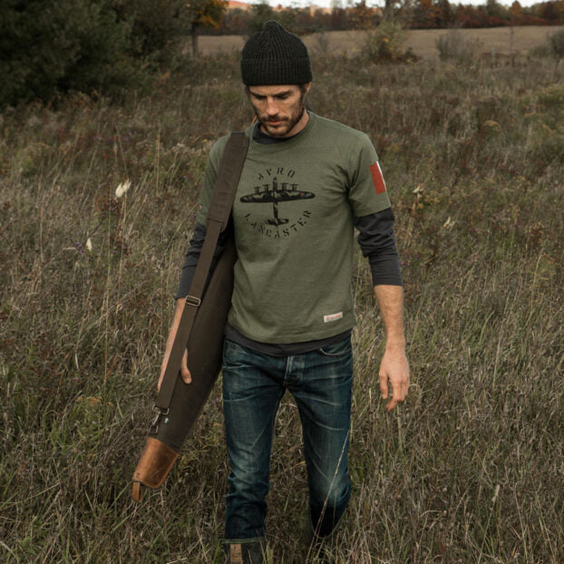 The Avro Lancaster is one of the most iconic aircraft deployed in the Second World War. Its unmistakable shape and the roar of its four Rolls Royce Merlin engines can only be experienced by seeing the two remaining airworthy examples in the world fly. One is in England and another is based at the Canadian Warplane Heritage Museum in Hamilton, Ontario. We are lucky to see the Canadian Lanc fly regularly around Toronto and were inspired to celebrate this incredible piece of Aviation History with our short sleeve cotton crew neck shirt. It features the tail colours of CGVRA on the left upper arm.