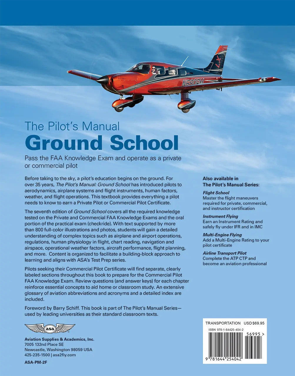 The seventh edition of Ground School covers all the required knowledge tested on the Private and Commercial FAA Knowledge Exams and the oral portion of the practical exam (checkride). With text supported by more than 800 full-color illustrations and photos, students will gain a detailed understanding of complex topics such as airplane and airport operations, regulations, human physiology in flight, chart reading, navigation and airspace, operational weather factors, aircraft performance, flight planning, and more. Content is organized to facilitate a building-block approach to learning and aligns with ASA’s Test Prep series.